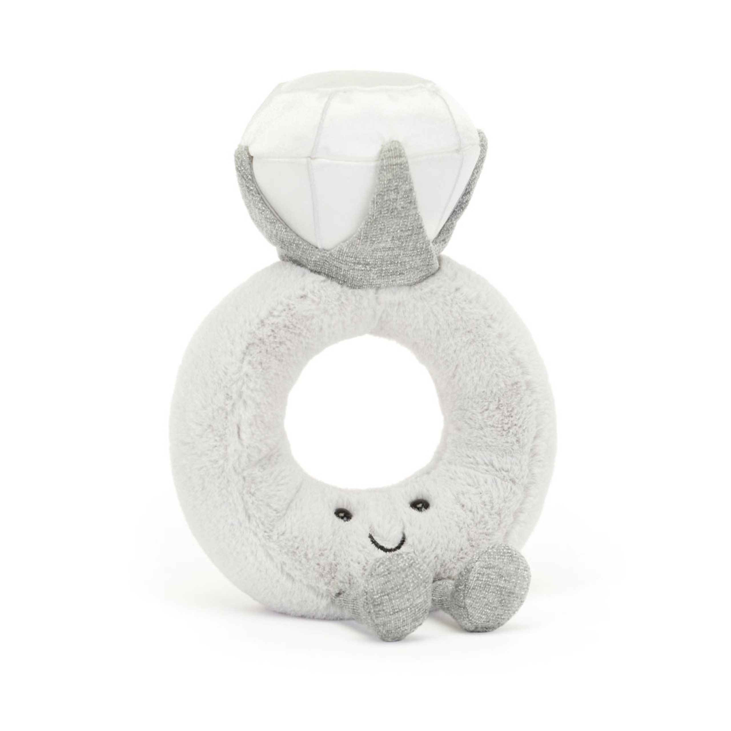 Amuseables Diamond Ring is a stunning solitaire set in a band of soft grey fur, presented in a grey glitter jersey bag you can embroider with a special message. With a choice of fonts and thread colors, you can share joy with a truly unique Amuseable Diamond Ring.